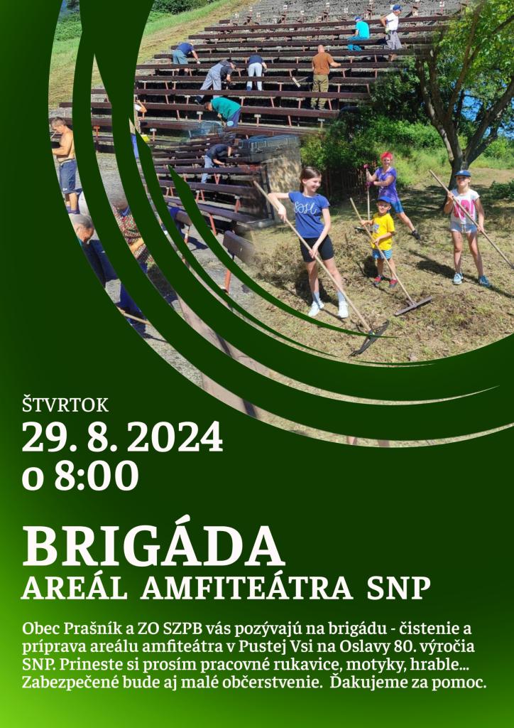 Obec Prašník a ZO SZPB vás pozývajú na letnú brigádu - čistenie a príprava areálu amfiteátra v Pustej Vsi na Oslavy 80. výročia SNP. Prineste si prosím pracovné rukavice, motyky, hrable a iné potrebné náradie. Zabezpečené bude aj malé občerstvenie. Ďakujeme za vašu pomoc.