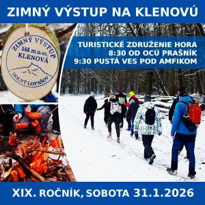 Turistické združenie HORA Prašník pozýva na XIX. ročník zimného výstupu na Klenovú. Zraz účastníkov je o 8:30 pred Obecným úradom v Prašníku. Trasa vedie cez Pustú Ves a ponúka možnosť opekania pod Klenovou. Pridajte sa k nám na tento nezabudnuteľný zážitok!