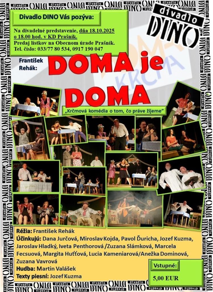 Obec Prašník v spolupráci s divadlom DINO vás srdečne pozývajú na divadelné predstavenie DOMA je DOMA, ktoré sa odohrá v sobotu 18.10.2025 o 18:00 v KD Prašník.