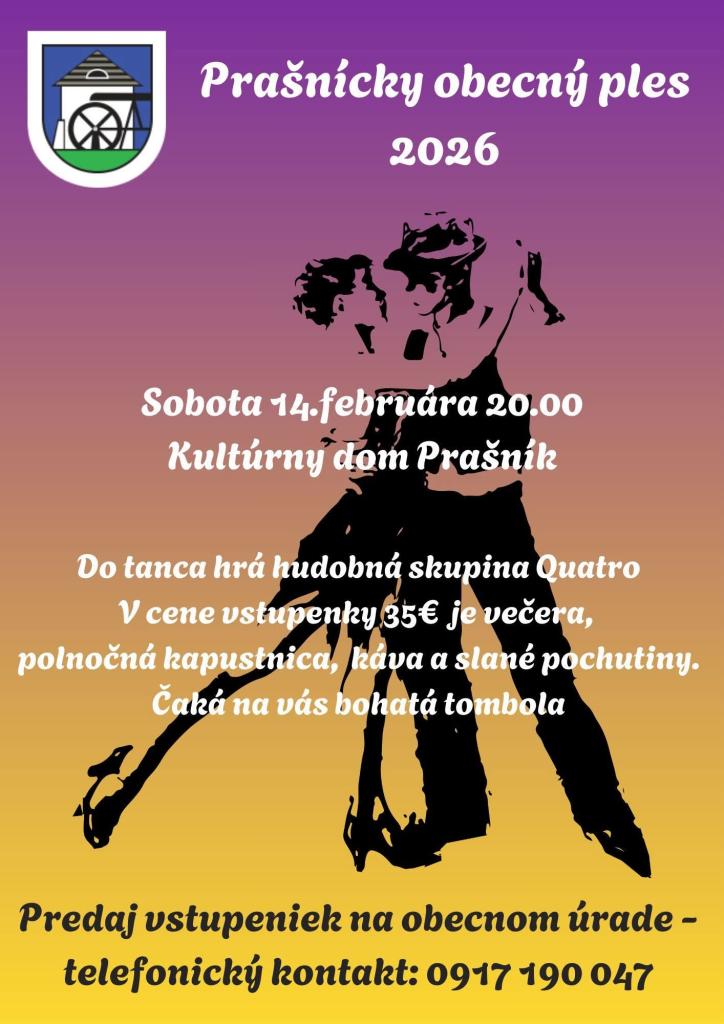 Prašnícky obecný ples sa koná v sobotu 14. februára 2026 vo veľkej sále KD Prašník od 20:00. Vstupné 35 € zahŕňa večeru, polnočnú kapustnicu, kávu a slané pochutiny. O zábavu sa postará hudobná skupina QUATRO a bude pripravená aj bohatá tombola.