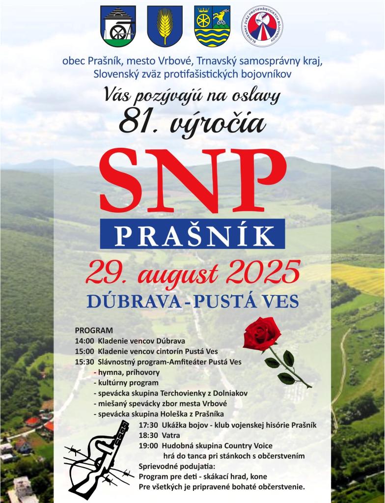 Pietny akt kladenia vencov pri pamätníku na Dúbrave a slávnostný program v amfiteátri SNP v Prašníku - Pustej Vsi sa konali v našej obci v piatok 29.8.2025. Ďakujeme všetkým za zdarný a dôstojný priebeh osláv 81. výročia SNP.